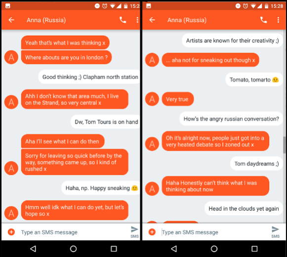As part of the physical escalation, I took a good look at her Michael Kors bracelet (£115… just looked it up). It turned out that her family was incredibly rich, and that her Dad had bought an apartment on the Strand for him to stay in while he worked in London. Anna had told her parents that she was going out for lunch and later on on our way back to the station (more spoilers!) she lied to her parents over the phone about how she was walking along the Thames now and would be back home in 30 minutes. I wasn’t surprised, but it was delivered in such a believable tone that it stuck with me.
