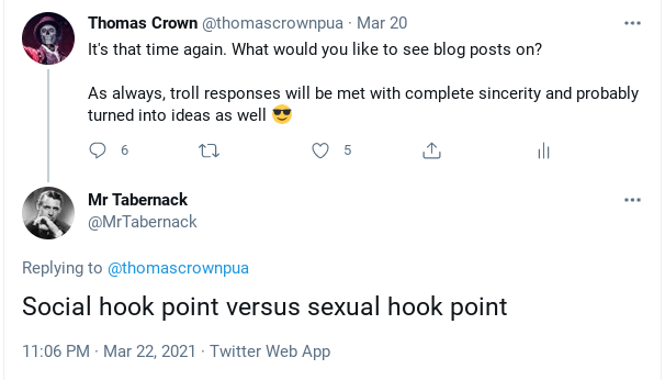 Let’s start with how I define social hook points. To me that means the girl is willing to give you some time, but it says nothing for her interest (the conversations have that mushy, sludgy quality to them, or alternatively the girl is chirpy but talks pure comfort and doesn’t have the right kind of eye contact). If you achieve sexual hook point, then she’s sexually interested, and you can tell that by any number of standard IOIs, but in particular, good eye contact, proximity and allowing your small kino attempts.