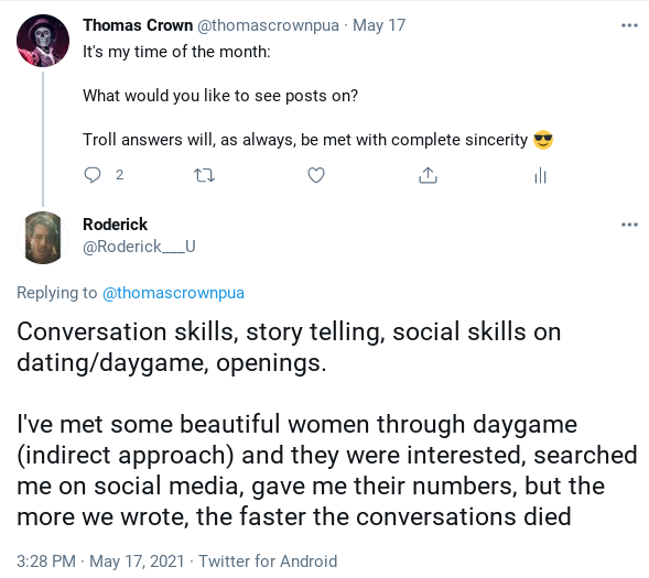 Now, even though this was just about opening, there are a couple of lessons to be taken forward into everything you say to a girl. The first is that you can create open loops, but more generally: never tell her everything, straight away. You can always build suspense into what you say by delaying the flow of information. The second is that girls (just like every human) are primarily interested in themselves, and not what you think or say.
