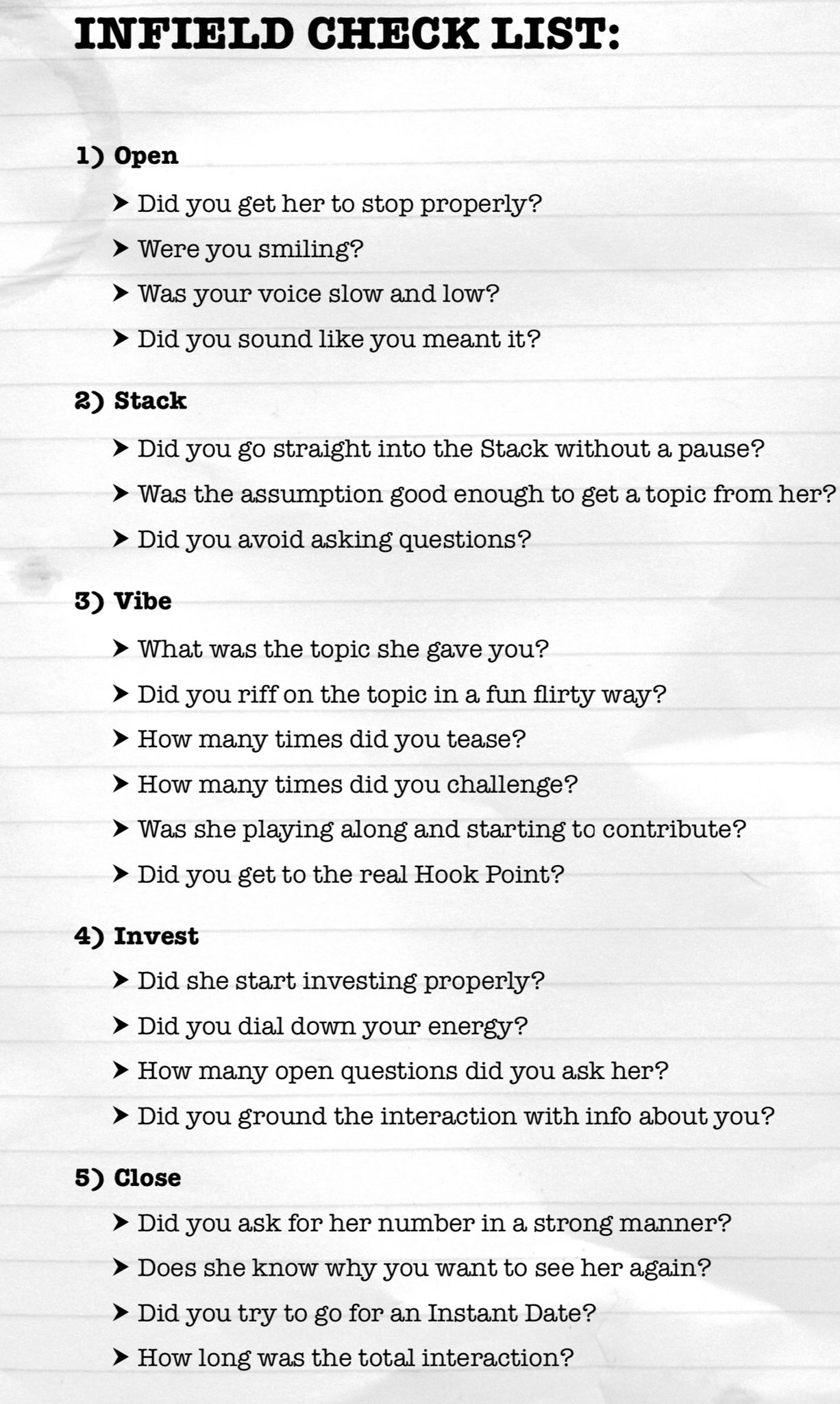 - Remove: “did you ground the interaction?” as I believe that grounding is a bit of a myth. I think that as long as the set wasn’t too short, she will come up with something in her mind to associate you with, even if that is just “the guy who approached me in the street.”