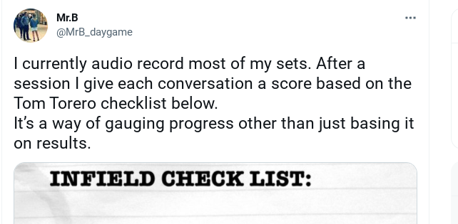 There’s an example of progressive overload in action. Simply score yourself using the above checklist and try to get that score higher over time. Once you see the score plateauing for a while – let’s say a couple of weeks – then have a wing watch you in-set and think about what girls you are approaching (i.e. look to start improving your pre-approach).