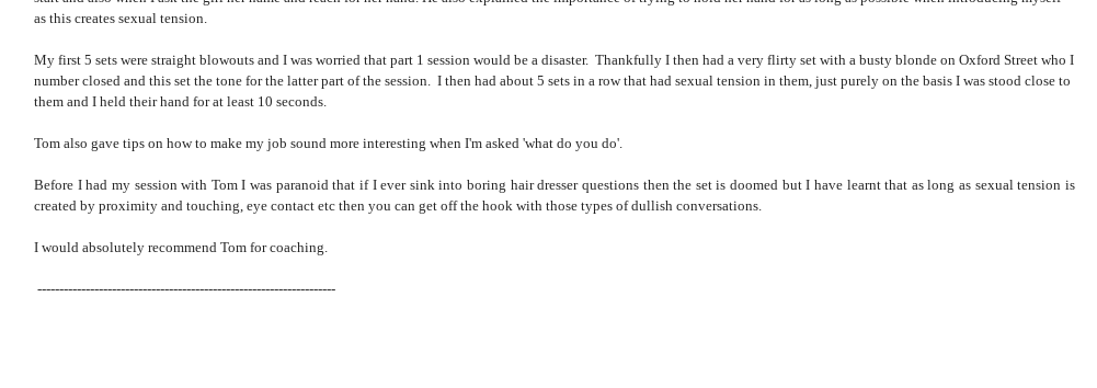 Before the coaching session with Tom I was obsessed with the exact words I was saying to the girl and put the main emphasis on that. Tom explained how that is only a small part of it and explained how good body language, touching etc can create a better set that thinking of better words to use. He explained the importance of taking a step in at the start and also when I ask the girl her name and reach for her hand. He also explained the importance of trying to hold her hand for as long as possible when introducing myself as this creates sexual tension.