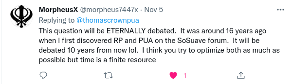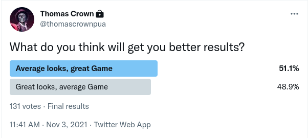 I posed the below question on my Twitter recently. I wanted to find out what guys would prefer to have, and implicitly find out which they thought was more effective and had more power. It was really interesting to see the near perfect 50/50 split in results (I myself would have gone with “great looks, average Game”). I’ve also included one of the responses to the poll from MorpheusX because he raises a great point: try and optimise both given finite time and resources. The results would suggest that half of the people who responded would rather tilt their efforts towards Game, and the other half towards looks.