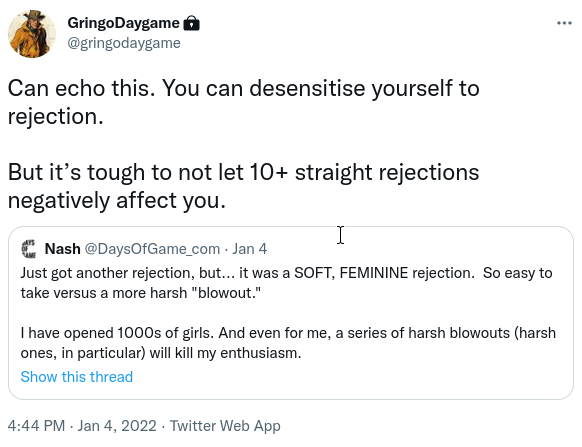 Over time, rejection becomes less impactful. After all, it’s easy to reason that it shouldn’t: what should one person’s opinion matter to you given you knew them for all of two seconds and will never see them again? But you should never want the sting of rejection to go away completely, because if it does – and there’s no better way to put it – there’s something wrong with you.